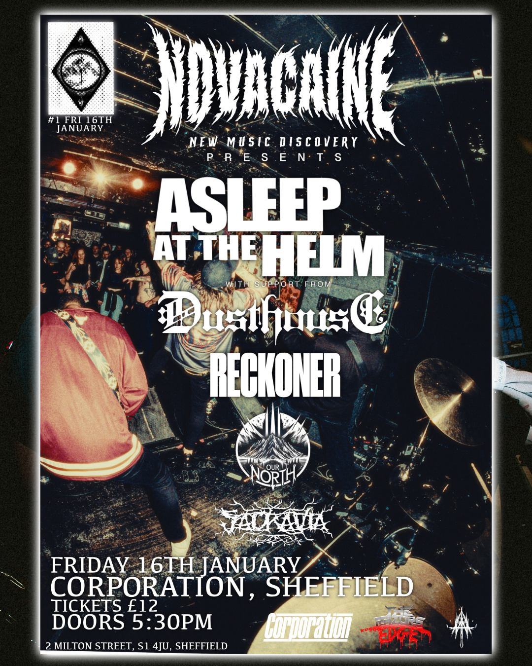 Asleep at the Helm returned to Corporation, Sheffield, on Friday 16th January 2026 igniting the pit alongside incredible support from DUSTHOUSE, RECKONER, Our North, and SACRAVIA.
